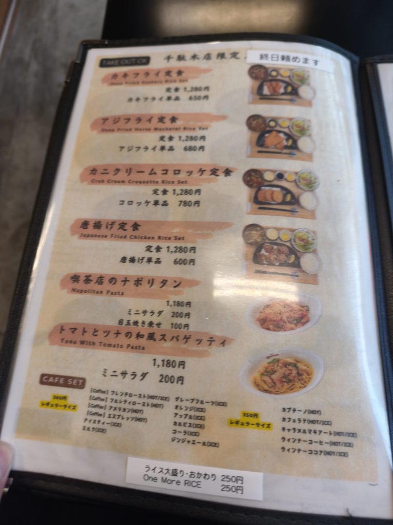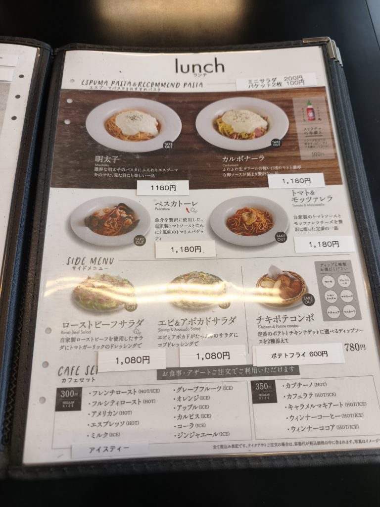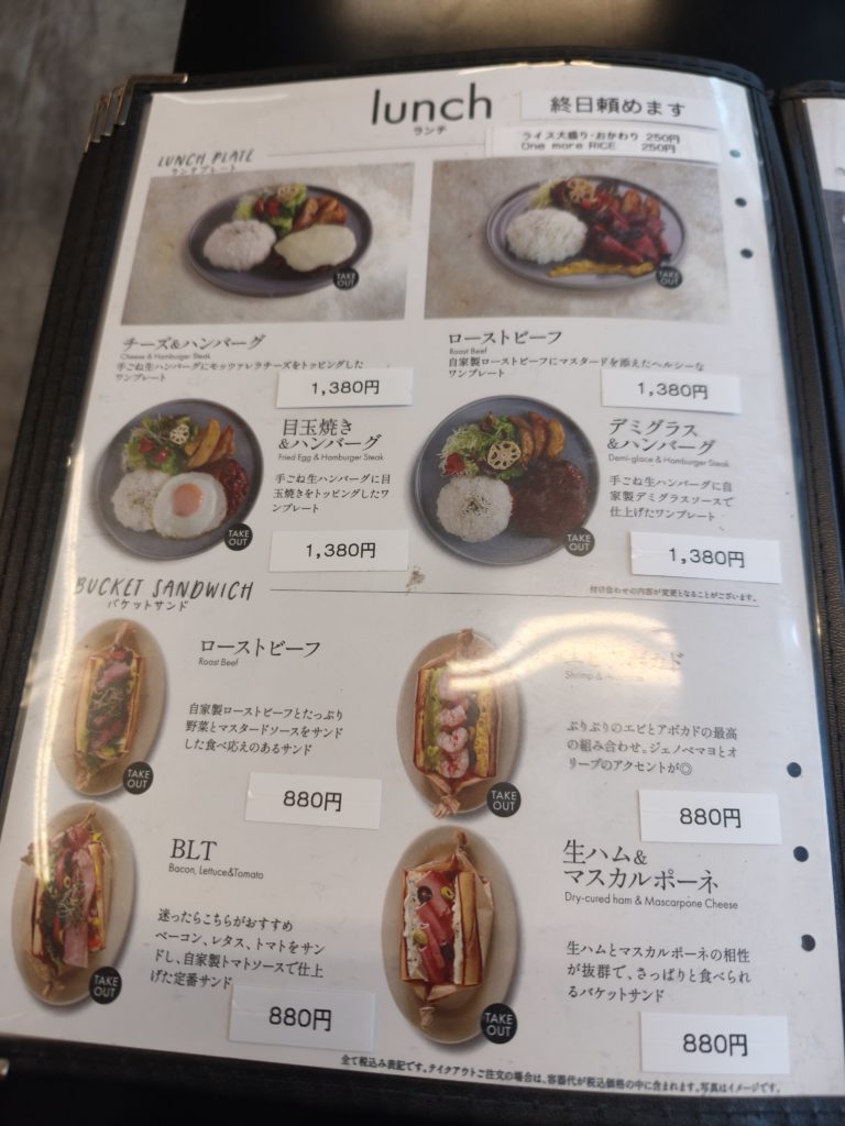 ランチメニューがとても豊富でした。ランチといいつつ、終日頼めるものもあるようです。注文は座席に聞きに来てくれて、会計も席で払うことも可能でした。