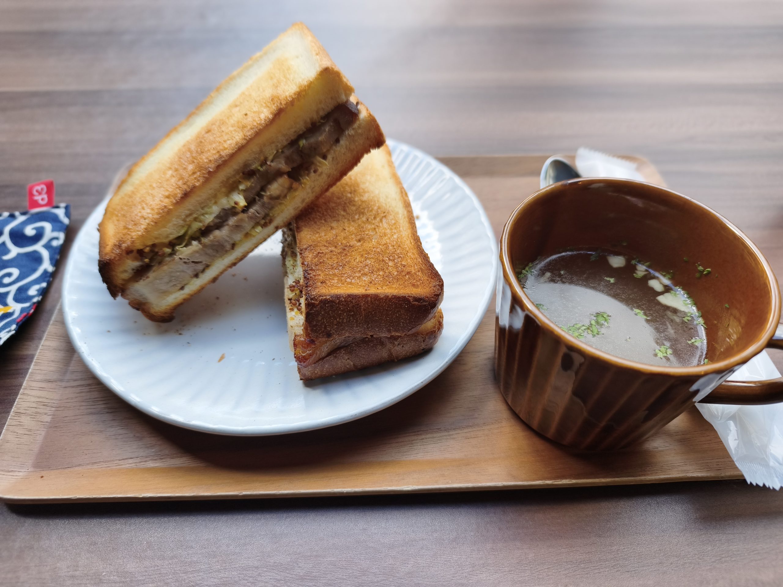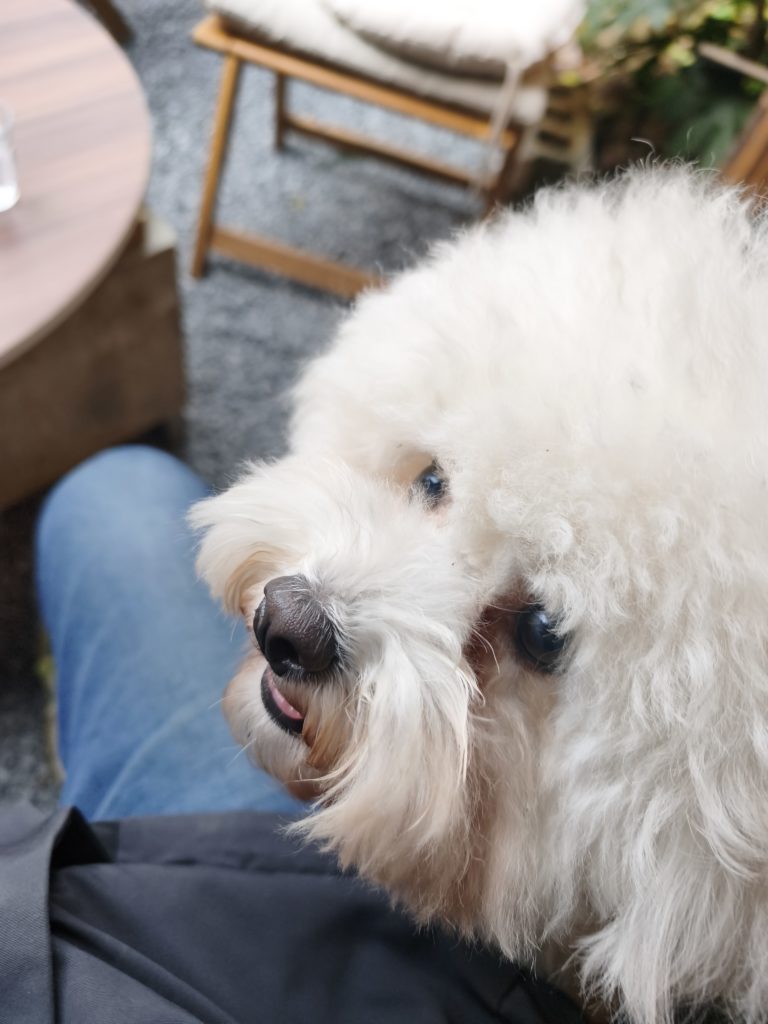 座席には呼び出し用のブザーがあり、座席にて注文と会計が可能なので、1人+犬のテラス席でも困りません。