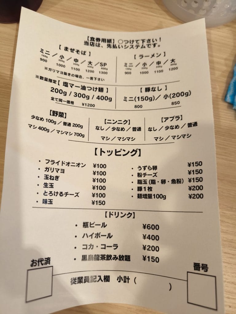コールは最初にオーダー用紙に書くシステムでヤサイ、ニンニク、アブラがマシマシまで可能です