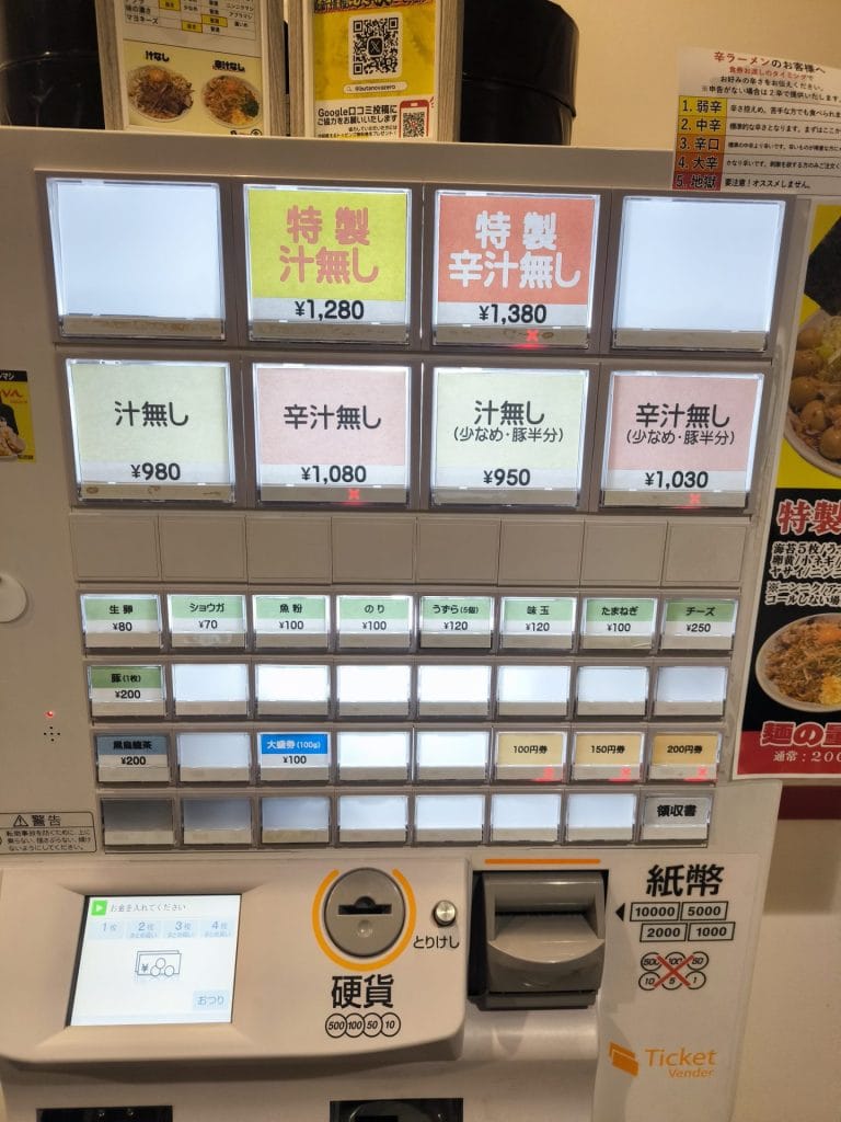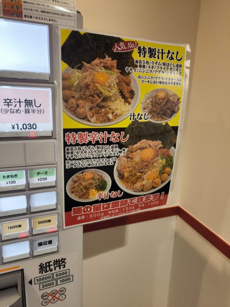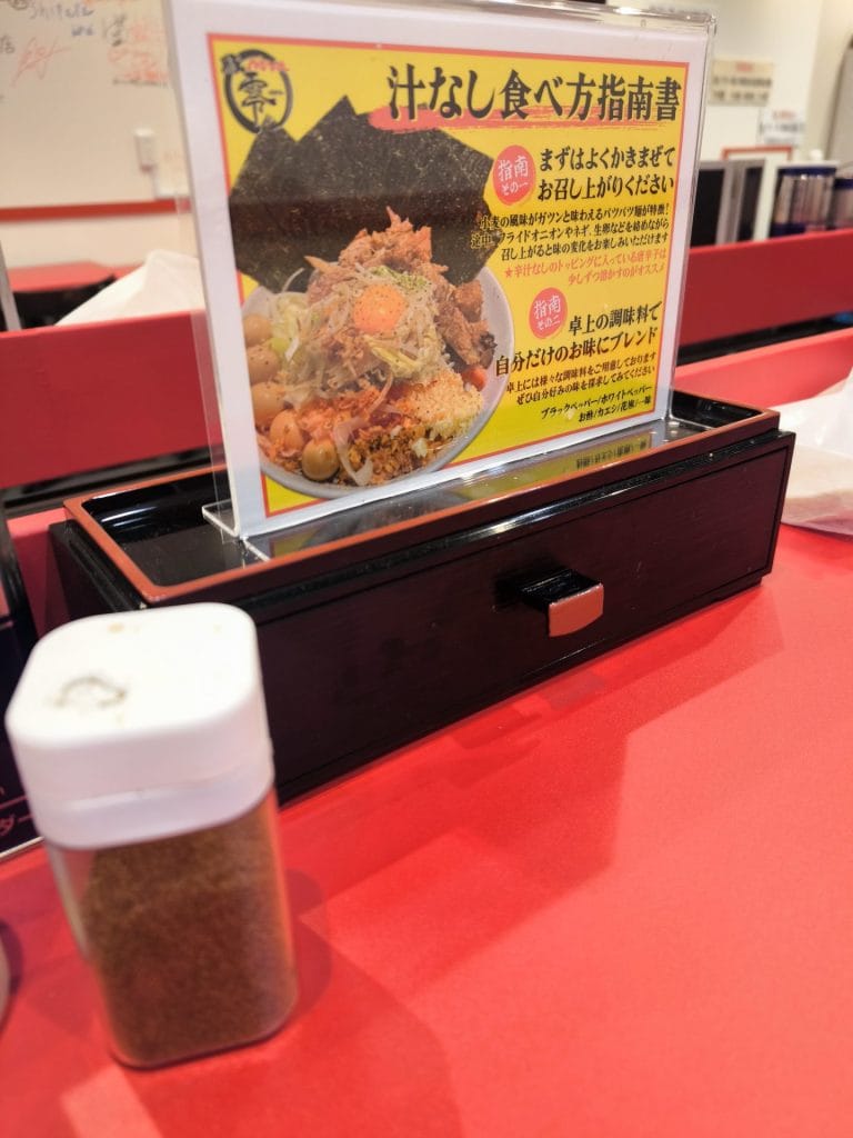 最初に食券を渡す際に聞かれるのでそこで伝えます。ニンニク・アブラ・味の濃さ・マヨネーズのトッピングが可能です。