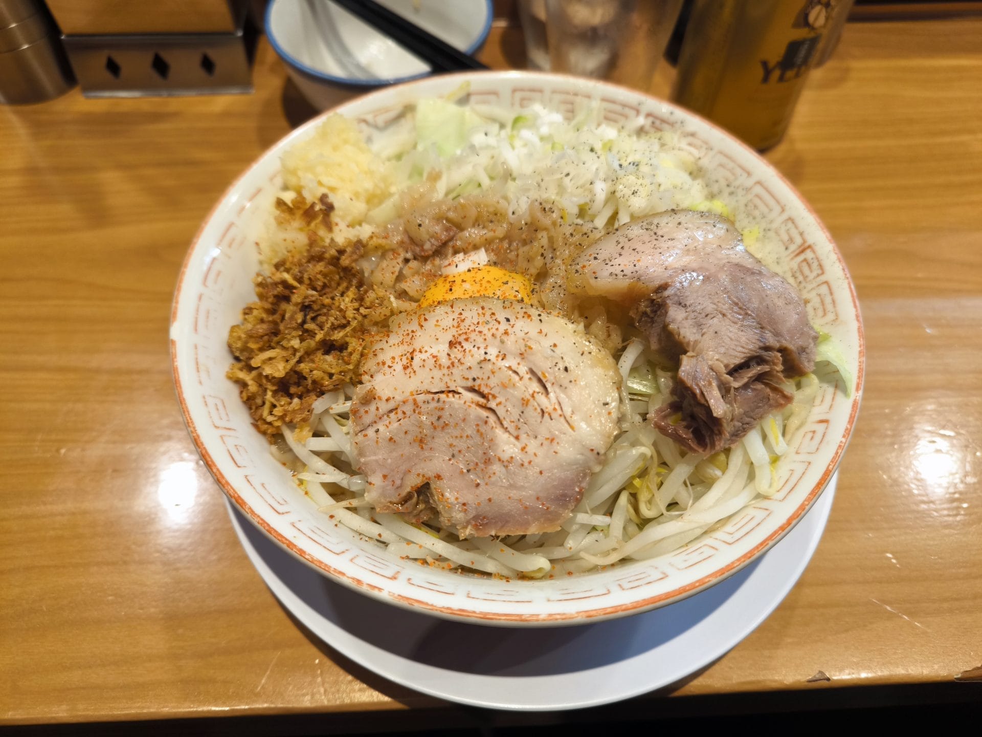 提供直前に聞かれます。ヤサイ・ニンニク・アブラの量のコールが可能です。マシまで可能です。