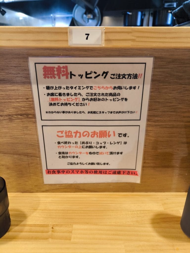 コールは提供前に席の番号で聞かれます。ラーメンは野菜マシ、ニンニク、油、カラアゲのトッピングが可能です。